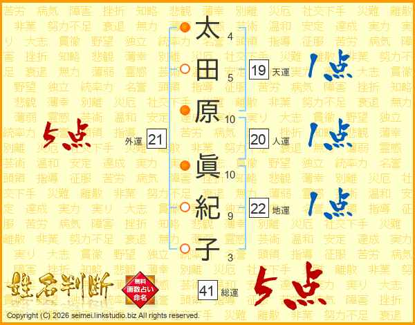 太(4画)田(5画)原(10画) 眞(10画)紀(9画)子(3画)
