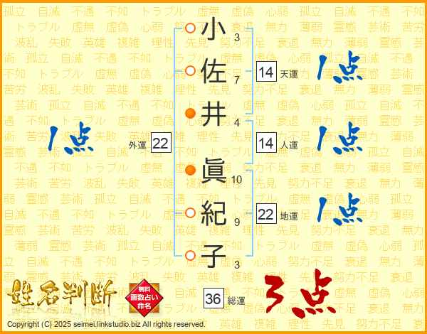 小(3画)佐(7画)井(4画)  眞(10画)紀(9画)子(3画)