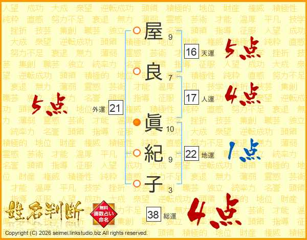 屋(9画)良(7画) 眞(10画)紀(9画)子(3画)