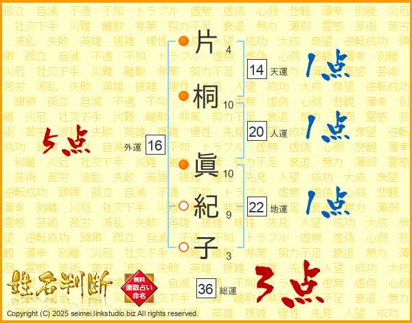 片(4画)桐(10画) 眞(10画)紀(9画)子(3画)