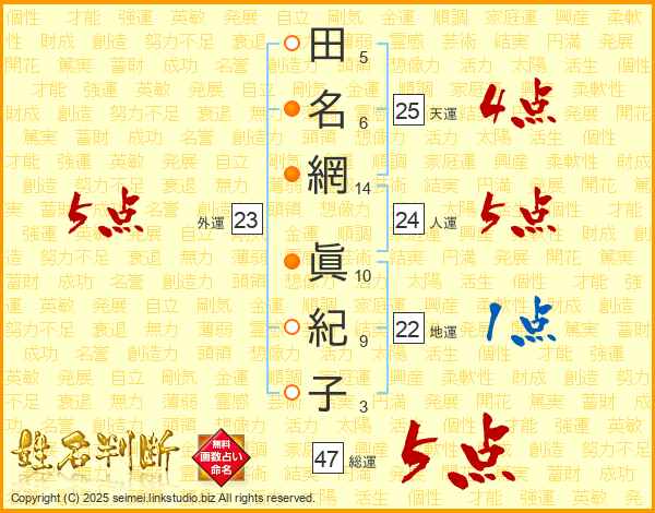 田(5画)名(6画)網(14画) 眞(10画)紀(9画)子(3画)
