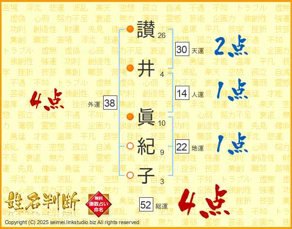 讃(26画)井(4画) 眞(10画)紀(9画)子(3画)