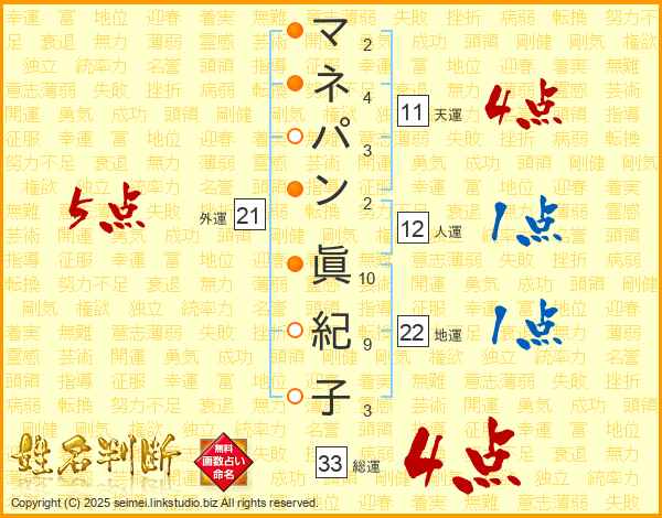 マ(2画)ネ(4画)パ(3画)ン(2画) 眞(10画)紀(9画)子(3画)
