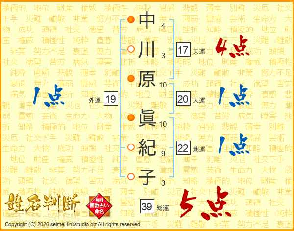 中川原眞紀子さんの総運は39画の5点!