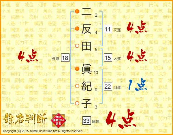 二(2画)反(4画)田(5画) 眞(10画)紀(9画)子(3画)