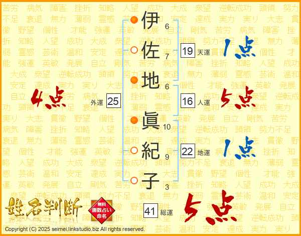伊(6画)佐(7画)地(6画) 眞(10画)紀(9画)子(3画)
