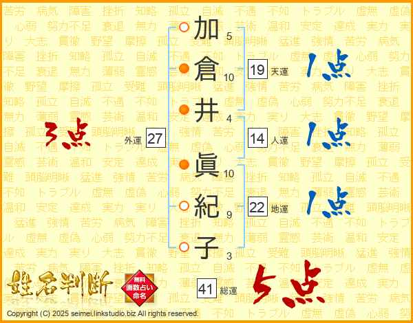加(5画)倉(10画)井(4画) 眞(10画)紀(9画)子(3画)