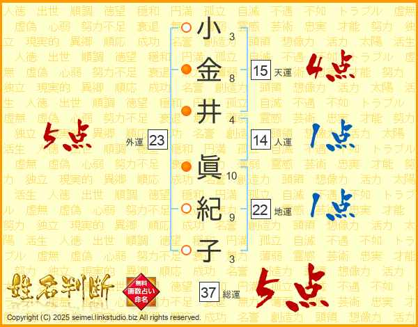 小(3画)金(8画)井(4画) 眞(10画)紀(9画)子(3画)