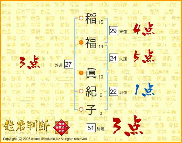 稲(15画)福(14画) 眞(10画)紀(9画)子(3画)