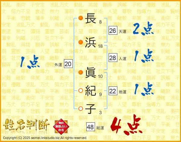 長(8画)浜(18画) 眞(10画)紀(9画)子(3画)