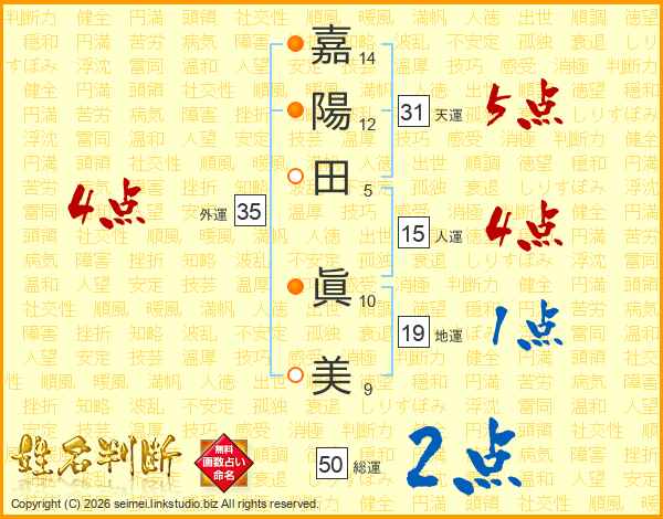 嘉(14画)陽(12画)田(5画) 眞(10画)美(9画)
