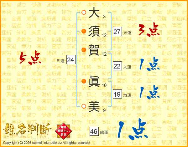 大(3画)須(12画)賀(12画) 眞(10画)美(9画)