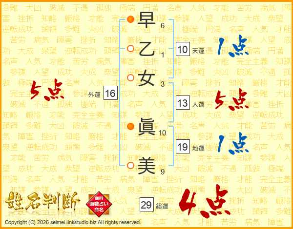 早乙女眞美さんの外運は16画の5点!