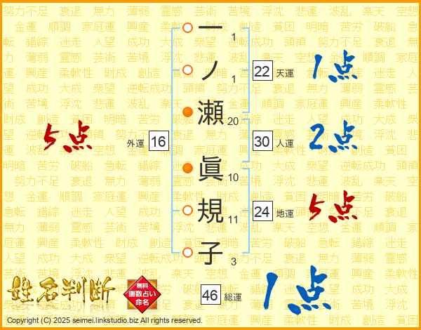 一(1画)ノ(1画)瀬(20画) 眞(10画)規(11画)子(3画)