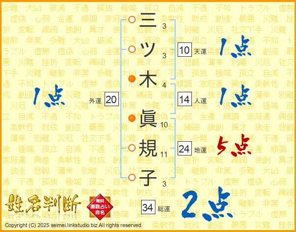 三(3画)ツ(3画)木(4画) 眞(10画)規(11画)子(3画)
