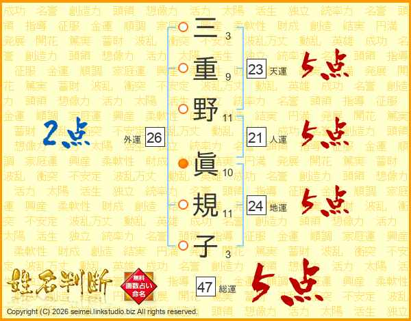 三(3画)重(9画)野(11画) 眞(10画)規(11画)子(3画)
