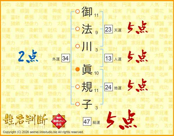 御(11画)法(9画)川(3画) 眞(10画)規(11画)子(3画)