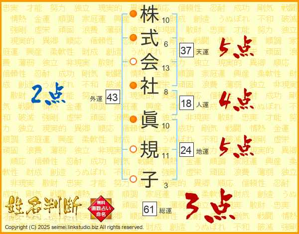 株式会社眞規子さんの総運は61画の3点!