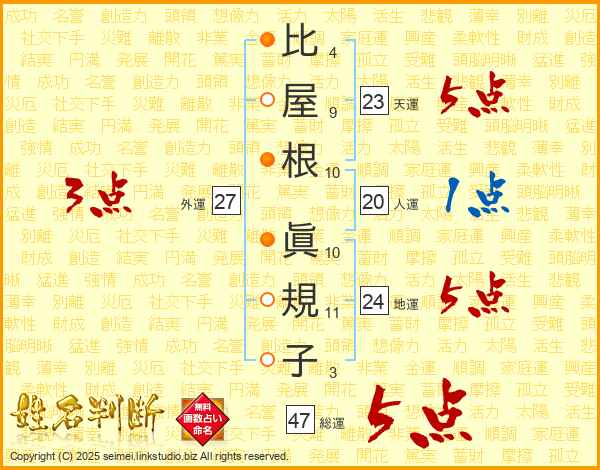 比(4画)屋(9画)根(10画) 眞(10画)規(11画)子(3画)