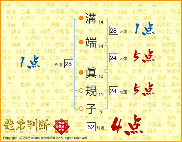 溝(14画)端(14画) 眞(10画)規(11画)子(3画)