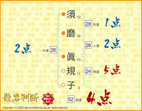 須磨眞規子さんの総運は52画の4点!