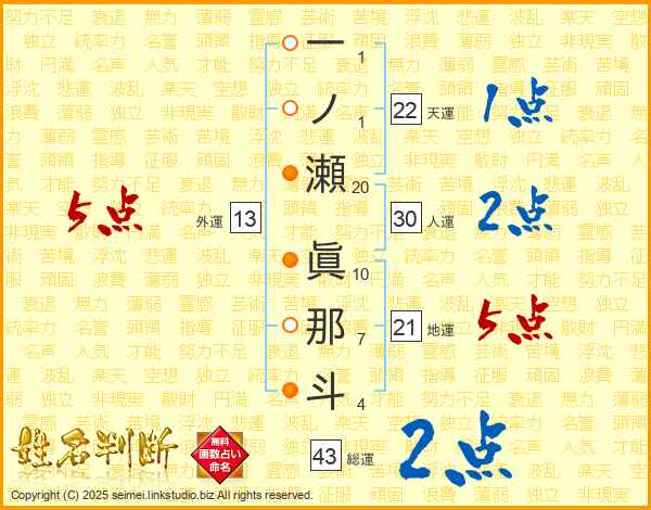一ノ瀬眞那斗さんの総運は43画の2点!