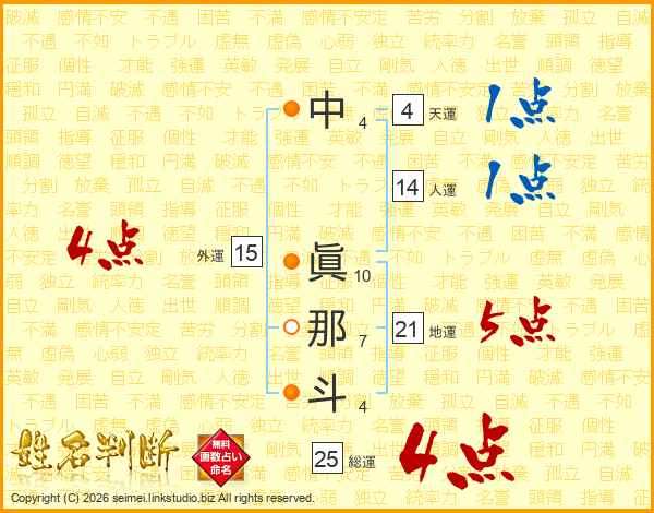 中眞那斗さんの総運は25画の4点!