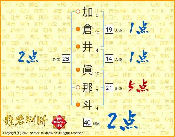 加(5画)倉(10画)井(4画) 眞(10画)那(7画)斗(4画)