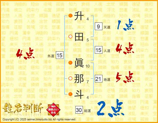 升(4画)田(5画) 眞(10画)那(7画)斗(4画)