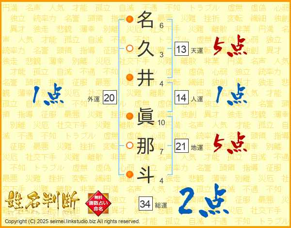 名(6画)久(3画)井(4画) 眞(10画)那(7画)斗(4画)