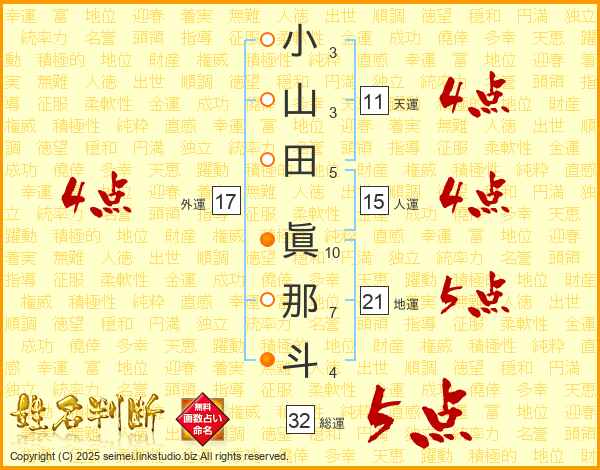 小(3画)山(3画)田(5画) 眞(10画)那(7画)斗(4画)