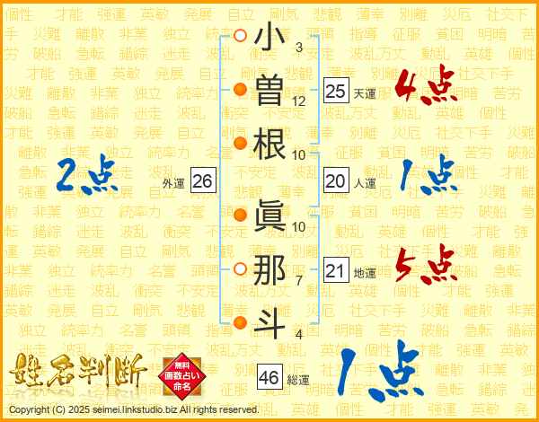 小(3画)曽(12画)根(10画) 眞(10画)那(7画)斗(4画)