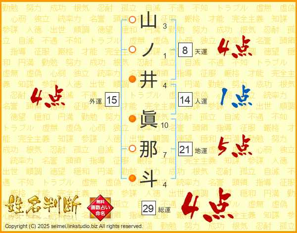 山ノ井眞那斗さんの総運は29画の4点!