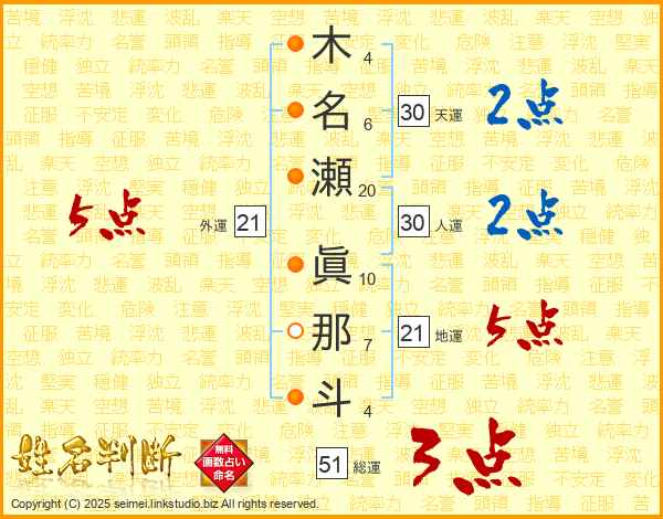 木(4画)名(6画)瀬(20画) 眞(10画)那(7画)斗(4画)