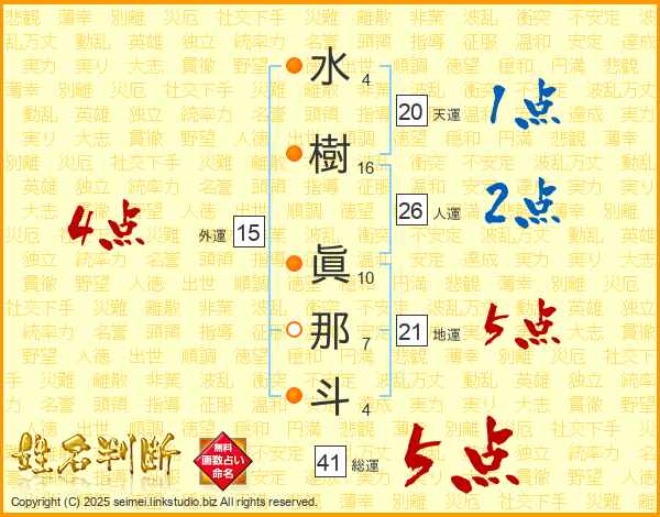 水(4画)樹(16画) 眞(10画)那(7画)斗(4画)