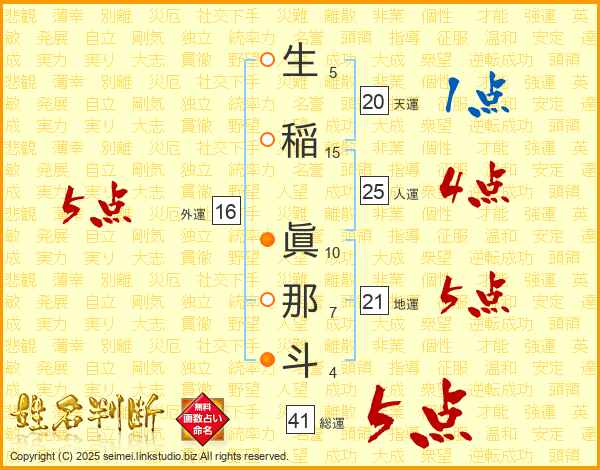 生(5画)稲(15画) 眞(10画)那(7画)斗(4画)