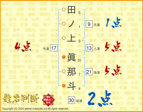 田(5画)ノ(1画)上(3画) 眞(10画)那(7画)斗(4画)
