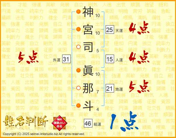 神(10画)宮(10画)司(5画) 眞(10画)那(7画)斗(4画)