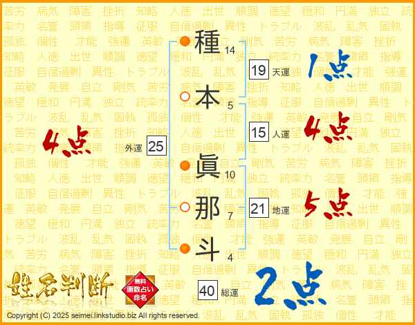 種(14画)本(5画) 眞(10画)那(7画)斗(4画)