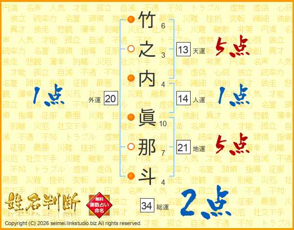 竹(6画)之(3画)内(4画) 眞(10画)那(7画)斗(4画)