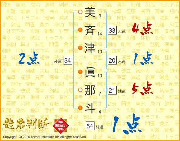 美(9画)斉(14画)津(10画) 眞(10画)那(7画)斗(4画)