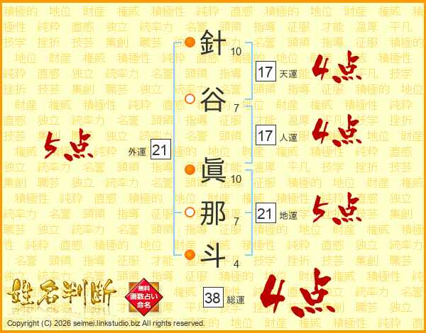 針(10画)谷(7画) 眞(10画)那(7画)斗(4画)