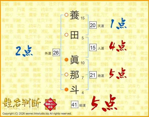 養田眞那斗さんの総運は41画の5点!