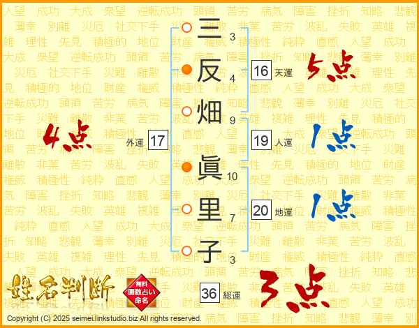 三(3画)反(4画)畑(9画) 眞(10画)里(7画)子(3画)