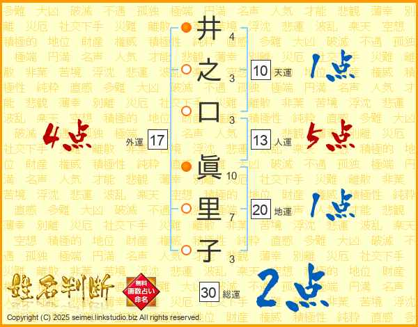 井(4画)之(3画)口(3画) 眞(10画)里(7画)子(3画)