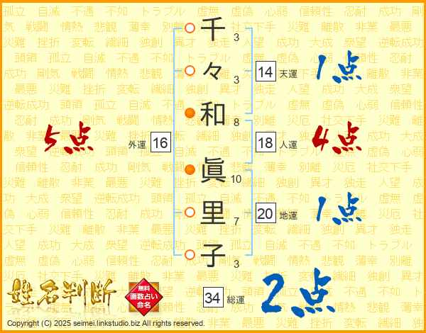千(3画)々(3画)和(8画) 眞(10画)里(7画)子(3画)