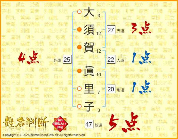 大(3画)須(12画)賀(12画) 眞(10画)里(7画)子(3画)