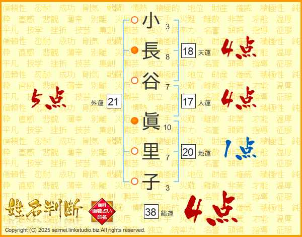 小長谷眞里子さんの総運は38画の4点!