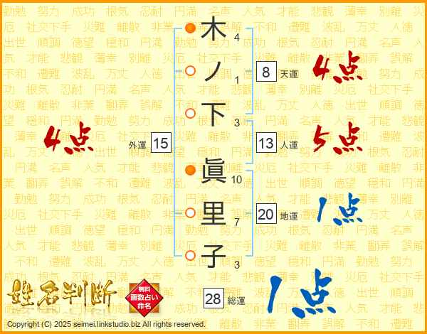 木(4画)ノ(1画)下(3画) 眞(10画)里(7画)子(3画)