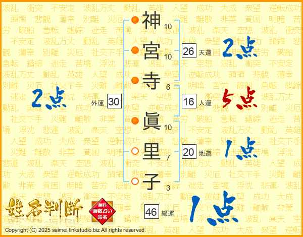 神(10画)宮(10画)寺(6画) 眞(10画)里(7画)子(3画)